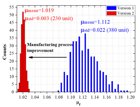 In addition to the measurements mentioned above, other parameters were also checked, including the magnetic permeability, hermeticity, and button gap. The magnetic permeability of the first batch of feedthroughs did not satisfy the requirements. After the production process was improved, the magnetic permeability was approximately 1.02, which was the same as that required for the vacuum pipe. Because the size of the feedthrough is small and the magnetic permeability of most feedthroughs is less than 1.03, we decided to accept the feedthroughs. The magnetic permeability measurement results for the two batches of feedthroughs before and after the production process improvement are shown in Figure 14. Some of the unqualified feedthroughs were used for prototype and booster BPM production, and the rest were abandoned. The statistics of magnetic permeability and other previous test results are summarized in Table 8, which can be used as a reference for other accelerator projects.