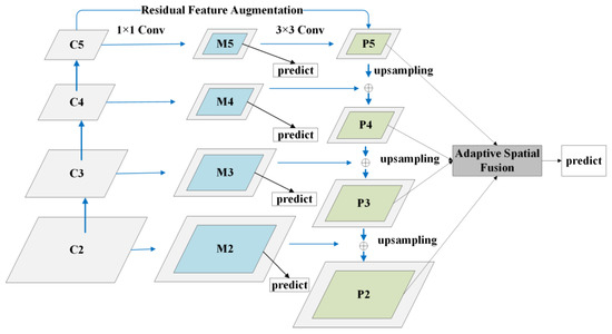 - Residual feature augmentation: The proportional invariant and adaptive pooling strategies were used to capture different context features and reduce information loss. Meanwhile, spatial context information extraction was used to reduce the information loss in the M5 channel and to improve the performance of the feature pyramid. Specifically, the C5 layer with scale S was performed with adaptive pooling with a constant proportion, and multiple scale feature maps could then be obtained. Next, the channel dimension was reduced to 256 through a 1 × 1 convolution. Finally, up-sampling was performed on the scale of S through the bi-linear interpolation of the feature maps. However, the interpolation operation could result in aliasing, i.e., the image gray was discontinuous and a jagged shape could appear in the area with a drastic grayscale change. To this end, an adaptive spatial fusion module was introduced to adaptively learn the weight. The features of the different layers were then fused with adaptive weights in the training process instead of through direct addition.