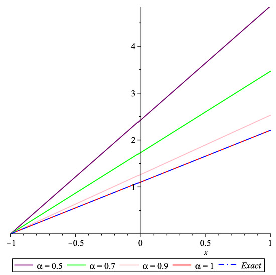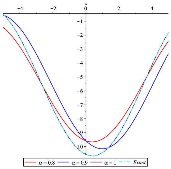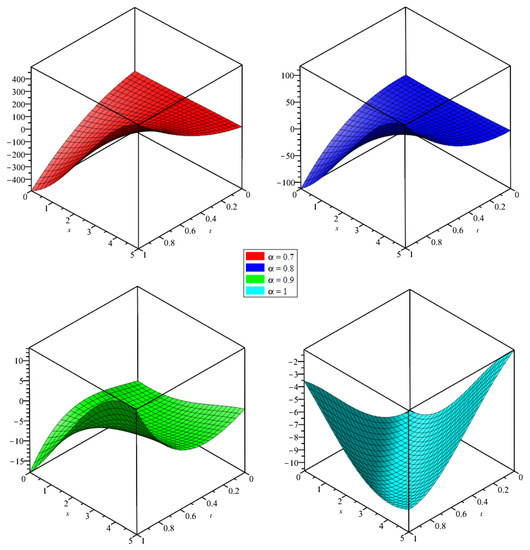 In Figure 1, two dimensional graph of analytical solutions of Problem 1 at various values of . In Figure 2, 3D plots of approximate solutions to Problem 1 at various values of . In Figure 3, 3D plots of approximate solution at and the exact solutions for Problem 2. In Figure 4, 2D plots of the exact and approximate solutions for Problem 2 at various values of . In Figure 5, three dimensional plots of approximate solutions for Problem 2 at various values of . In Figure 6, 3D plots of approximate solution at and exact solutions for Problem 2. In Table 1 and Table 2, absolute error of the exact and fourth term approximate solutions for Problem 1 and 2 with various and for .