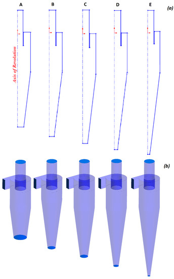 A Stairmand high-efficiency cyclone [30] was considered for analysis. It consists of a cylinder-on-cone configuration with a tangential inlet. The schematic is presented in Figure 1, and the concerning dimensions are given in Table 1. The main body diameter (D) was taken as 0.29 m for all the models. As mentioned earlier, we considered elongation of the conical segment such that the apex cone angle remained the same in all cases. Thus, increasing the cone length (Hc) also influenced the bottom opening (Bc). For instance, increasing the cone length value (Hc/D) from 1.5 to 3.5 reduced the bottom opening value (Bc/D) from 0.3125 to 0.0625. The details have been provided in Table 1. Hence, the cyclone performance was an interaction of the two geometrical entities viz. the cone length and cone tip diameter. A complete detail of all the cyclone models is represented as a 2-D sketch in Figure 2a and the respective 3-D geometry is shown in Figure 2b.