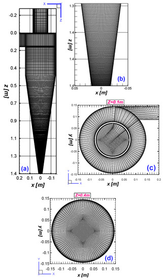 Details of the mesh for model E, consisting of nearly 1.88 million hexahedra; (a) mesh representation on the cyclone surface, (b) mesh refinement in the lower part of the cyclone, (c) a cut plane at Z = 0.1 m, representing the mesh, and (d) a cut plane at Z = 0.4 m, representing the mesh.