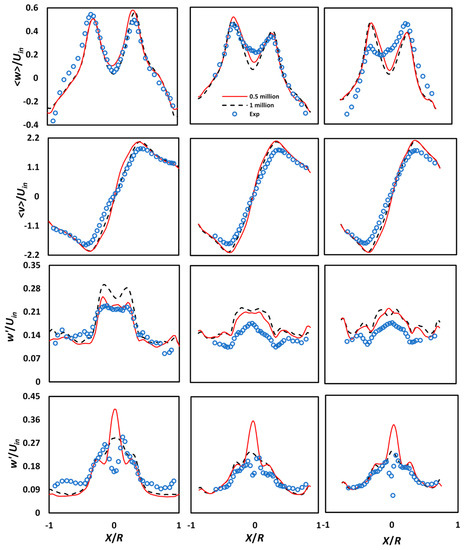 Using LES, the numerically generated mean and fluctuating values of the tangential and axial components are compared with that of the reference model [2] at Reynolds number (Re) = 2.8 ∙ 105. Two levels of the grid have been evaluated. The average values of the axial and tangential velocity components are shown in the first and second rows of Figure 4. Differences in results between grid levels are minimal, indicating that the solution is grid independent. Moreover, the coarse and fine mesh results agree very well with the experimental data. However, the coarse mesh results at Z/D = 1.0 showed the smallest deviation in the mean axial velocity, whereas at Z/D = 2.0 and Z/D = 2.5, the local dip near the axis overshot moderately. The third and fourth lines of Figure 4 represent the rmse values of the axial and tangential velocities, respectively. A good agreement between the rmse values and experimental data was observed, particularly in the outer vortex region. However, in the core region, a mild increase in the rmse axial velocity was observed. It becomes apparent from the last row of Figure 4 that the nature of rmse tangential velocity was different from the reference data near the central axis of the cyclone, whereas the former exhibits a local shoot-up rather than a dip. The mesh refinement could be responsible for the small errors (e.g., in the mean velocity profiles) getting amplified in the precession-induced fluctuation levels. Such discrepancies in the mean and rmse velocity profiles have also been reported in several previous studies [33,34,35]. Hence, despite the known issues with resolving the flow anisotropy using advanced closure LES, the simulation procedure may be applied to all future simulations.