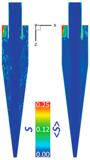 It becomes apparent that a major part in the flow regime is well-resolved, whereas the contribution from the SGS models is very small and limited only to the annular region close to the inlet duct. The same is demonstrated by both the instantaneous as well as means values of S in Figure 5. Since the grid in all the parts of the cyclone, other than in the conical section along the z-direction, is identical, the same holds for all the models. Hence, the results for cyclone model E alone are presented here.
