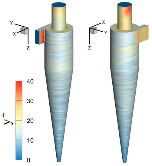 The first cell height that is adjacent to the solid boundaries plays an important role in the accuracy of the results. The centroid of the first cell near the solid wall falls within the log-law regime, and the solver applies the law-of-the-wall approach. Here, as mentioned earlier, we present the y+ values (cf. Figure 6) only for cyclone variant E. It becomes apparent that the global y+ value does not exceed 40, which indicates a fair figure with the wall-modeling approach.