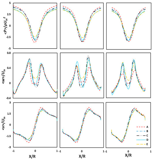 The contour plots of the time-averaged static pressure, tangential velocity, and axial velocity in all the cyclone models are shown in Figure 7, and their respective radial profiles at three cut sections along the cyclone axis (Z/D = 1.0, 2.0, and 3.0) are presented in Figure 8. The pressure distribution is almost identical in all the models. In the core region, we noticed a negative pressure region, which meant that the pressure dropped below the atmospheric pressure. The static pressure was at maximum in the outer region near the solid walls, and this value reduced significantly as we moved toward the center. The wall static pressure was at maximum in model A, at minimum in model E, and intermediate in models B–D. The cyclone models having larger wall static pressure values in general indicate higher pressure losses.