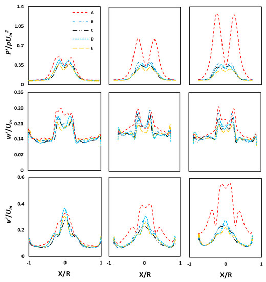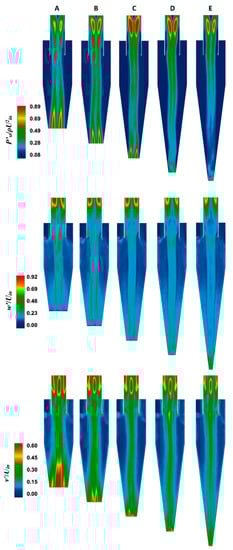 Cyclonic flows encounter coherent fluctuations in the core region, accompanied by weak turbulent fluctuations in the outer vortex regime [37]. These fluctuations are mainly responsible for particle dispersion near the wall. In the present work, the fluctuations are represented by root mean square error (rmse) values. The contour plots and the radial profiles are shown in Figure 9 and Figure 10, respectively. The first, second, and third rows represent, respectively, the static pressure fluctuations, the axial velocity fluctuations, and tangential velocity fluctuations. It is apparent that the pressure as well as the axial and tangential velocity components exhibit a significantly higher level of fluctuations in the core region than in the outer vortex region. These fluctuations, in the vortex core region of the cyclone, take place due to the precessing of the rope-like coherent structure about the geometrical axis. In the outer vortex, the (weak) turbulent fluctuations that have the least contributions from the (strong) coherent fluctuations persist. Two important observations here are that (a) the pressure and velocity fluctuations reduce with an increase in the cone length, and (b) the tangential velocity fluctuations are much stronger than the axial velocity fluctuations. Figure 10 shows the radial plots of rmse values of scalar and vector fields, wherein the fluctuation levels are much higher close to the bottom of the cyclone and near the exit plane. The latter arises due to the movement of the vortex core end near the edge of the outlet plane. Interestingly, the level of fluctuations at the cyclone bottom surface is much larger in model A and lowest in model E. This is due to the fact that the larger bottom plane diameter (such as in model A) serves more space for the lateral movement of the precessing vortex core end on that plane, and this freedom to precess over a narrow plane is highly restricted (such as in model E). A similar observation holds in the radial plots of rmse values in Figure 10. The tangential velocity fluctuations are larger in model C, followed by model D. For other models, these values decrease with an increase in the cone length. At a given station, the complex variations in different models are due to the combined effect of the contracting conical region at the lower end and the elongation of the cone. In other words, the inner vortex experiences an elongation in length, followed by lateral contraction with an increase in cone length.