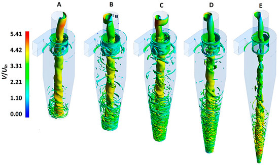 When the axis of the swirling coherent structure gets displaced from the geometric centerline and starts precessing about it, the phenomenon is termed a precession vortex core (PVC). The frequency of the PVC is considered an important factor and is generally governed by the cyclone geometry and the operating conditions [38]. Figure 11 represents the vortex core representation based on the λ2 criterion. The vortex core resembles a twisted rope-like structure extending throughout the cyclone length. The λ2 criterion represents the coherent structures based upon the iso-surface values: at different values, eddies with different length scales appear. However, we selected a value of 0.35, which was found to be a good balance for the visualization of the vortex core. Interestingly, in the core region, the diameter of the coherent structure seemingly reduces from models A–E.