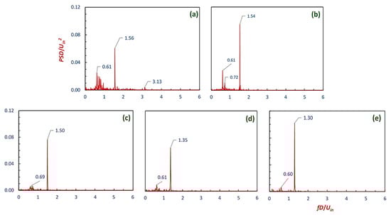 PSD plots derived by FFT of the recorded tangential velocity time-series data at X/D = Y/D = Z/D = 0 for all models. The data were extracted at an inlet velocity, Uin = 15 m/s for (a) model A, (b) model B, (c) model C, (d) model D, and (e) model E.