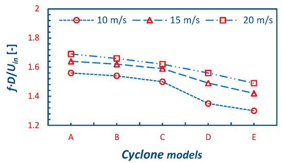 The PVC is a mechanism that shows certain irregularities viz. phase jump and non-uniform amplitudes [37]. To identify the periodicity, Fast Fourier Transformation (FFT) was applied over the time-dependent variables. Here, the tangential velocity signal was recorded at a point (X/D = Y/D = Z/D = 0). Figure 12a–e shows the power spectral density (PSD) plots, normalized with the square of the inlet velocity, for all the cyclone models A–E, respectively. The frequency is represented in dimensionless form as a Strouhal number, given as St = fD/Uin, with f, the frequency (in Hz); D, the cyclone main body diameter (in m); and Uin, the inlet velocity (in m/s). Multiple peaks with a very low power were observed in the frequency range of 0 to 50 Hz in nearly all the models. However, in the frequency band ranging from 50 to 100 Hz, a prominent spectral peak was observed that corresponds to the principal frequency of the flow system. The power related to the lower harmonic is considerably less than the higher harmonic in cyclone model E. For cyclones A–E, the corresponding frequencies of the lower harmonic were calculated as St1 = 0.61, 0.61, 0.69, 0.61, 0.61, and 0.60, whereas the frequency of the higher harmonic in cyclones from models A–E was calculated as St2 = 1.56, 1.54, 1.50, 1.35, and 1.30, respectively. Interestingly, the principal frequency reduced with an increase in the cone length for all inlet velocities, as represented in Figure 13.
