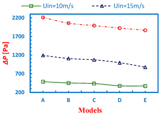 The pressure drop values in all the cyclone variants at the inlet velocity (a) Uin = 10 m/s, (b) 15 m/s, and (c) 20 m/s.