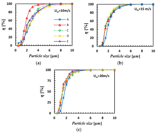The grade efficiency curves of all cyclone variants at the inlet velocity, (a) Uin=10 m/s, (b) 15 m/s, and (c) 20 m/s (from left to right).