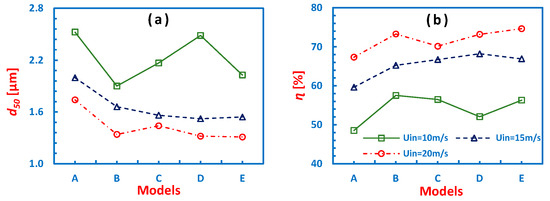 Figure 15 shows GECs for all the models operating at different inlet velocities. Surprisingly, a gradual shift in the GECs is not observed with increasing cone length despite a reduction in the peak values of tangential velocity. Figure 16a summarizes the cut-off values at different inlet velocities. It becomes apparent that only at 15 m/s, the d50 values reduce consistently with length, whereas at the lower and upper values of inlet velocities, the results are dramatic. It is observed that at 10 and 20 m/s, the lowest d50 value exists for cyclone model B, and for all Uin, d50 is the largest for model A. Figure 16b illustrates the total collection efficiency for all models at different Uin. At the lower and upper limits of velocity, cyclone model B has the highest value of η, whereas cyclone model A has the lowest value of η. However, Brar et al. [17] reported a consistent reduction in d50, and an increase in η with an increase in the cone length (cf. Figure 13, p. 675; and Figure 15 p. 676). The difference in the results is due to the fact that in the present study, given that the apex cone angle is held fixed, the cone tip (a lower bottom opening) undergoes a significant reduction in the diameter with an increase in the length of the conical segment, whereas in another study [17], the cone-tip diameter remained the same for each increment in the cone length. There is a contradictory nature in the mean tangential velocity and the velocity fluctuation fields: the former acts as a source of centrifuging the solid particles towards the outer walls, while the latter has a strong tendency to disperse these particles (which causes a reduction in the collection efficiency) [39]. Hence, the variations in the collection efficiency and cut-off particle size are due to the combined effect of the mean as well as the fluctuating flow field, particularly in the lower part of the cyclone, where a large variation in the latter exists (cf. Figure 9).