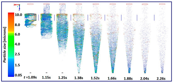 Particle traces (colored with particle diameters) in cyclone model E at Uin = 15 m/s and at different time intervals.