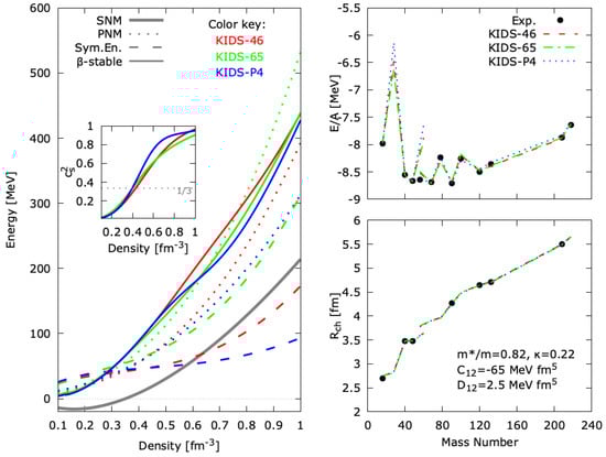 KIDS was introduced in Ref. [] in order to carry over what we know from quantum many-body theory and from effective field theories about the static, cold, homogeneous Fermi system of nuclear matter, namely that its energetics are expressed in terms of the Fermi momentum or the cubic root of the density, into a model for homogeneous matter and eventually for nuclei. Fits to EoS pseudodata from ab initio calculations revealed the naturalness of the power expansion and its convergeness [,]. It was also realized that any density dependence of the EoS can be generated by a Skyrme-type EDF with extended density dependence. The reverse engineering of the EDF for nuclei from the EoS of homogeneous matter was first demonstrated in Ref. [] and carried out more fully in Ref. [] and finally in Ref. [], where the APR EoS was converted to a Skyrme-type functional and was shown to give realistic results for closed-shell nuclei regardless of what we assumed for the effective mass. Noting that such a model, closely resembling the Skyrme functional, can be very easily implemented in existing nuclear structure codes (Hartree Fock, RPA, etc.), it is obvious that the framework offers enormous versatility in different directions, for example in exploring homogeneous matter or the influence of the effective mass in dynamic properties, as shown in subsequent applications. It can also be extended for application to hypernuclei, as shown in Ref. [].