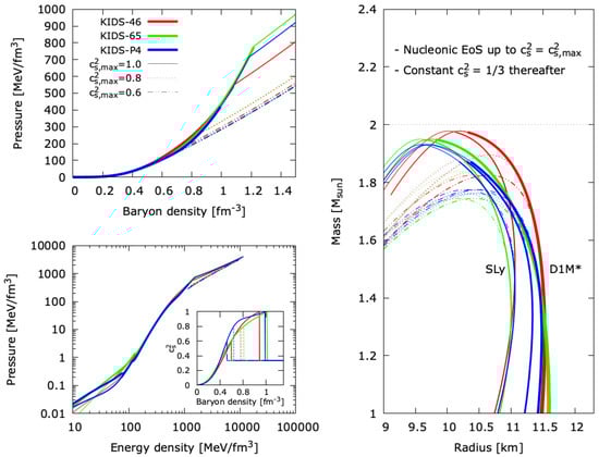 For matching the KIDS EoS and the CSS EoS, a number of scenarios can be considered. For , we could employ the parameter set already obtained in Ref. [] and interpolate at some high density, e.g., at about two times saturation density as suggested in that work. Here we will rather take advantage of the observation that the relations (49) remain valid for equilibrium matter (at least if one adopts the quadratic approximation for the dependence on isospin asymmetry, which is not necessarily valid, but is made here lacking a better option). Then the isospin degree of freedom need not be considered explicitly. Let us then simply assume that, up to some onset density , matter is described by KIDS, while beyond that, the total energy density and the pressure are given by Equation (49). Further assuming that at both P and are continuous (also not necessarily true in the presence of a phase transition), we can determine B and D from the values, according to the KIDS model, at the onset density, , . We get