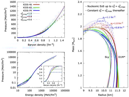 resulting from the general relativistic hydrostatic equations. In the above, G is Newton’s gravitational constant, is the amount of mass enclosed by a sphere of radius r around the star’s center, is the pressure at distance r from the center, and is the energy density at distance r. In practice, what is required is a tabulation of the baryonic density , pressure , and energy density , across a broad density regime from practically zero to several times the saturation density and assuming charge-neutral matter in equilibrium. The tabulated values are to be input into a numerical code that solves the above TOV equations. At each possible central density (density at the center of the star), the code yields the radius and total mass of the star []. The relation between the latter two quantities defines the neutron star mass–radius (NSMR) relation and is a major point of comparison with observations.