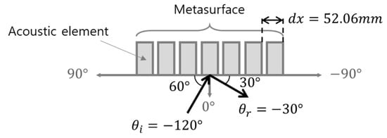 where is the incidence angle, is the angle of reflection, is the wavelength of the target frequency, is the acoustic element interval, and the phase delay interval. The acoustic element spacing can be derived by setting the incidence angle, angle of reflection, wavelength length, and phase delay spacing using the generalized Snell’s law. The incident and reflection angles were set to ensure that the sound wave propagation direction of the target frequency was refracted. The wavelength of the target frequency can be obtained using . Here, is the sound velocity, which is because the sound propagation medium is air. The phase delay interval is determined by the number of acoustic elements. A detailed explanation is provided in Section 2.1.2. Figure 1 is a schematic diagram of a metasurface to describe the parameters of the generalized Snell’s law. When the incident angle, reflection angle, and target frequency are selected as −120°, −30°, and 1500 Hz, respectively, the spacing of the acoustic elements can be derived as 52.06 mm using the generalized Snell’s law, as shown in Equation (1).