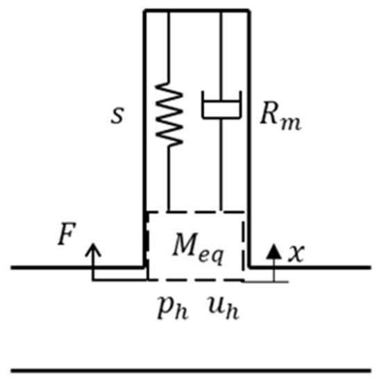 Solving for [T] requires knowing the acoustic impedance, and solving for acoustic impedance requires knowing the inlet equation of motion and the mechanical impedance of the acoustic element. Figure 3 shows a lumped model of the acoustic element, where is the effective mass, is the stiffness, is the mechanical resistance, is the external force acting on the acoustic element entrance, and is the displacement of the mass. Newton’s second law applied to the acoustic element in Figure 3, for a lumped parameter model including the damping effect, results in