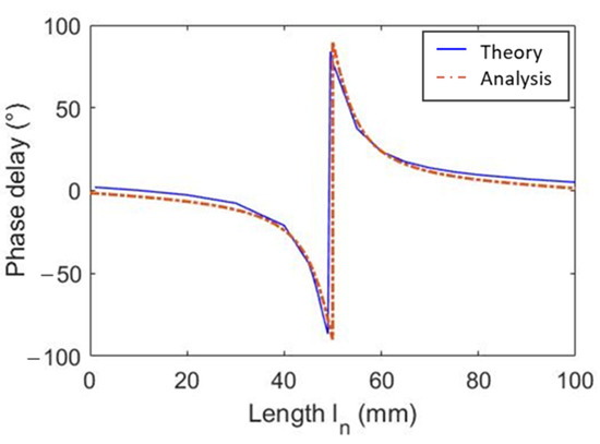 Substitute the real and imaginary values of the acoustic pressure transmission coefficient according to the length of the quarter-wave resonator into Equation (23). When deriving the phase delay graph as a function of the quarter-wave resonator length, an acoustic element length must be chosen for each phase delay interval () to cover the entire range from π/2 to π/2.