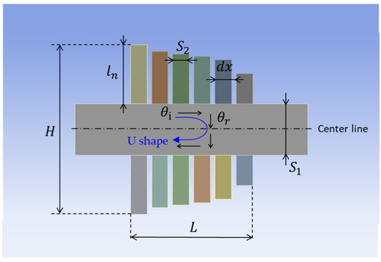 Figure 6 is a silencer with a quarter-wave resonator metasurface. The silencer using the metasurface was designed so that the direction of the sound wave at a specific frequency would be refracted in a U shape by arranging the metasurface at the top and bottom of the main duct. First, to derive the acoustic element spacing using the generalized Snell’s law, the incidence angle, angle of reflection, wavelength length, and phase delay spacing must be set. As shown in Figure 6, the angle of incidence and angle of reflection were set so that the sound wave propagation direction of the target frequency would be refracted in a U shape. The upper metasurface was designed to have an incidence angle of −90° and a refraction angle of 0° so that sound waves passing through the upper metasurface would be refracted to the lower metasurface. The lower metasurface was designed to return sound waves to the entrance of the duct, and the incident angle of this metasurface was 0°, and the reflection angle was 90°. This lower metasurface can be designed as a top-down symmetrical structure based on the center line of the upper metasurface. When the incident and the reflection angle of the upper and lower parts are substituted into the generalized Snell’s law described in Section 2.1, the acoustic element intervals are the same. Due to the angles of incidence and reflection of the upper and lower metasurfaces being set in this way, a U shaped refraction phenomenon may occur in the propagation direction of the sound wave at the target frequency at the part where the metasurface is mounted. As the wavelength of the target frequency is , it can be determined by selecting the target frequency. The target frequency was set to 1500 Hz. The phase delay interval was set to 30°, and the details are detailed in the next paragraph. To achieve U shaped refraction at the target frequency, the spacing of the acoustic elements was set to 19.05 mm using the angle of incidence, angle of reflection, wavelength length, and phase delay interval. Table 1 lists the design dimensions derived using generalized Snell’s law.
