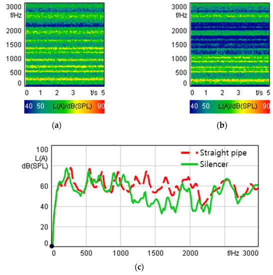 The silencer was produced by 3D printing and made of ABS, and the speaker test was performed by referring to Section 2.3. Figure 12 is the result of the silencer speaker test, Figure 12a shows the case of installing a straight pipe, and Figure 12b shows the case of installing a silencer. Here, the straight pipe means the case where the silencer was not installed. Figure 12a,b are the color maps, where red indicates a higher noise level and blue a lower one. Figure 12c is an SPL graph, and compares the noise level before and after installing the silencer to check the noise reduction effect. The noise reduction region of the silencer with the labyrinthine-type resonator metasurface is from 1430 to 1800 Hz, and it is confirmed that 30 dB was reduced at 1670 Hz.