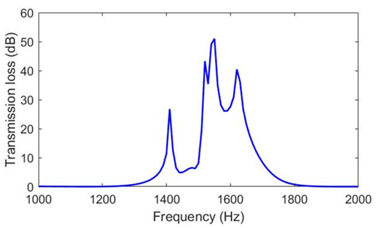 Figure 11 is a transmission loss graph to verify the noise reduction effect of the silencer with the labyrinthine-type resonator metasurface designed using ANSYS Acoustic, acoustic analysis software. In the transmission loss graph, the frequency domain was defined as the noise reduction domain when the transmission loss was 5 dB or more. Through Figure 11, it was confirmed that the reduction frequency range of the silencer was approximately 1380 to 1720 Hz, and it was confirmed that approximately 50 dB was reduced at 1550 Hz.