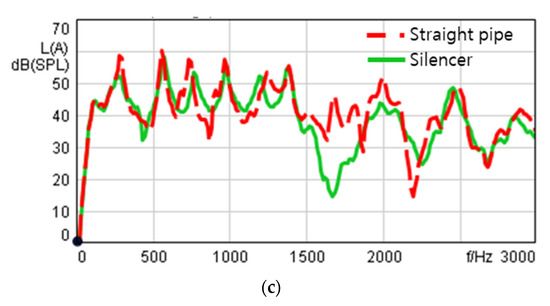 The silencer, which confirmed the metasurface effect through acoustic analysis, was produced by 3D printing and made of ABS. Referring to Section 2.3, a speaker test of a silencer with a quarter-wave resonator metasurface was performed. Figure 9 is the speaker test results to confirm the reduction effect of the silencer with quarter-wave resonator metasurface. Figure 9a shows the case of installing a straight pipe, and Figure 9b shows the case of installing a silencer. Here, the straight pipe means the case where the silencer is not installed. Figure 9c is a SPL (sound pressure level) graph, and to check the noise reduction effect, compare the noise level before and after the silencer was installed. Through Figure 9, it was confirmed that the noise reduction region of the silencer with a quarter-wave resonator metasurface was between 1130 and 2320 Hz, and the maximum reduction was about 30 dB.