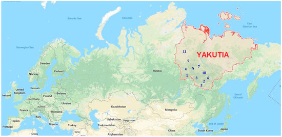 - Ivanov, I.N. (Ed.) Yakutia, Historical and Cultural Atlas; Publishing and Production Center “Design, Information. Cartography”: Moscow, Russia, 2007; p. 869. (In Russian) [Google Scholar]