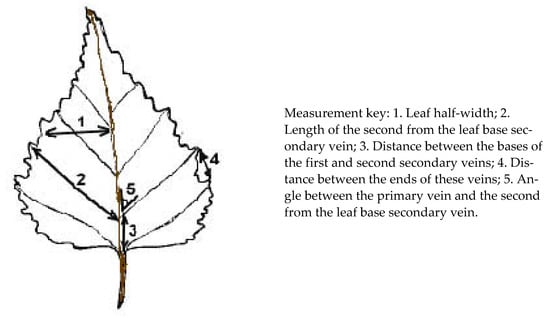 Material Volume: For FA assessment, at each site, 100 leaves were collected (10 leaves from 10 trees) from short shoots. A total of 13,000 leaves of Betula pendula were collected. The leaves were scanned at 300 dpi and then measured in the Bio software package; linear measurements were taken to an accuracy of 0.1 mm and angular measurements to 0.1°. FA was assessed by five characteristics of the lamina structure and venation (Figure 2).
