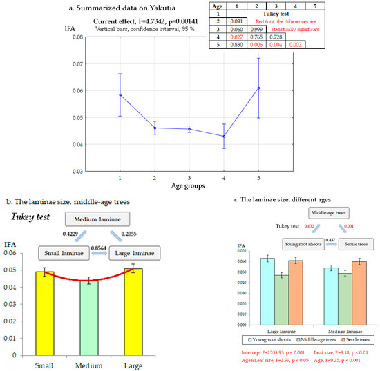 Dependency of the FA level in Betula pendula on tree age and leaf size. (a) Summarized data on Yakutia (n = 13,000). Age groups: 1, young shoots developing from adventitious buds; 2, prereproductive trees; 3, middle-age reproductive trees; 4, old reproductive trees; 5, senile trees. (b) Middle-age trees, one ecotope in region 10 (n = 300). (c) Comparison of different leaf sizes in different age groups, one ecotope, region 3 (n = 600). Note: red font indicates statistically significant differences; Tukey test. IFA, integrated fluctuating asymmetry.