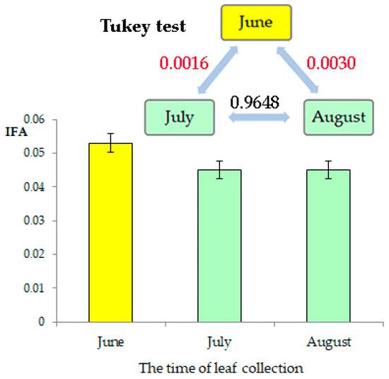 FA level in Betula pendula in different months. Region 2, middle-age trees (n = 300). Note: red font indicates statistically significant differences; Tukey test.