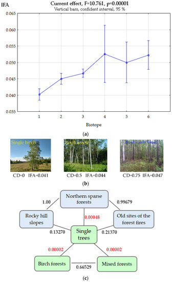 Since Betula pendula is a photophilic species, biotope type plays an important role in its existence, both for species composition and the nature of the crown density (Figure 6a,b). Biotopic differences were considered for the trees found in birch forests, in the undergrowth of mixed forests dominated by the larch, and also for the trees occuring separately or in small groups in meadows. Some limited material, 2–4 samples, was taken per biotope group: old sites of forest fires, rocky hill slopes, and northern and mountain sparse forests. The parameters taken into account were the crown density, the dominating tree species, and light and moisture conditions. An increase in FA was observed in the following sequence: sparse stands, birch forest, mixed forest (Figure 6a). At the same time, even in the biotopes exposed to indirect technogenic impact, FA level in the birch was comparable to that of the plants from natural biotopes, provided that the light conditions were suitable and the soil cover was undisturbed, as was observed in a number of cases in West Yakutia in the vicinity of mining enterprises and in urban conditions [13,26]. One-way ANOVA showed a high degree of statistical significance for the biotope factor, F = 10.76, p < 0.001. A more detailed analysis showed that statistically significant differences are observed only when the birch trees found in conditions of low crown density are compared to the trees found in the forests and in the conditions of the northern and montane sparse forests (Figure 6c). The IFA of the birch trees found at old forest fire sites and on rocky slopes was high, but the differences did not reach a statistically significant level. All other comparison options also showed no statistically significant differences, and when comparing three biotopes with unfavorable conditions (4–6), the Tukey test yielded a value of 0.98–1.0, indicating very high similarity.
