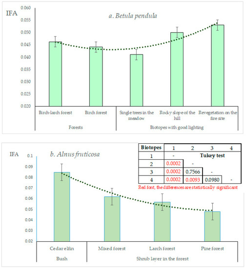 Other factors also should be taken into account, for example, the state of the soil cover and water availability. An increased asymmetry level was observed in trees growing on poor soils, for example, on the rocky slope of a hill and in a biotope formed as the result of post-fire succession (Figure 7a). There is evidence from other authors that plants growing on sites where a fire previously took place have an increased FA level, which according to Alves-Silva and Del-Claro, indicates a high stress level [81]. FA level can also be affected by intra- and interspecific competition in biotopes with high crown density. The presence of interspecific interactions for woody plants has long been known [82,83]. It turned out that in mixed forests dominated by the larch, FA level in birch usually was higher than in purely birch groves. A similar phenomenon can be observed in a related species, Alnus fruticosa Rupr. 1845, in which the most severe deviations from the symmetrical state of the leaf were observed in the biotopes where this species was in contact with the Siberian dwarf pine Pinus pumila (Pall.) Regel 1859, and a low level of IFA was found in the pine forest with dominant Pinus sylvestris L., 1753 (Figure 7b). ANOVA revealed high significance for the “biotope” factor, F = 37.04, p < 0.001, and a Tukey test yielded a statistically significant level when comparing the alder found in mixed biotopes with Pinus pumila and Betula pendula. It is possible that a certain role in the destabilization of development is played by interspecific interactions. In the presence of coniferous trees, the FA level of the birch and alder, as a rule, is higher than in deciduous forests with the same crown density; thus, it can be assumed that coniferous trees have a negative impact on these deciduous species.