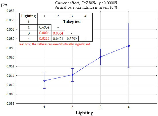 Nevertheless, in general, one-way ANOVA showed a high statistically significant dependence of FA on light conditions (Figure 8). There is information in the literature that an increased level of FA can be observed in plants in conditions of insufficient lighting, increased intra- and interspeific competition, and soil disturbance [47,50,84]. As for the moisture level of a biotope, a negative impact from both insufficient and excessive moisture was found (F = 4.98, p <0.01). In the conditions of the so-called alas landscapes in the valley of the Vilyuy River, a specific study of moisture conditions on the edges of the meadows was carried out. In that region, excessive moisture had a pronounced negative impact on FA level (R = 0.50, t = 2.73, p < 0.01). MANOVA, on the whole, corroborated the results of one-way ANOVA, demonstrating high significance for these factors (Intercept F = 561.68, p < 0.0001; Biotope F = 7.97, p < 0.0001; Lighting F = 3.96, p < 0.0098; Soil moisture F = 4.29, p < 0.0159).