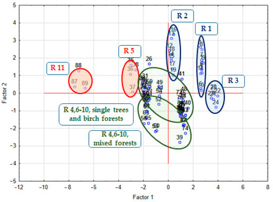 PCA results, ecotope ordination along the significant factors, Factor 1 and Factor 2. Note: Red outlines denote the periphery of the range; 35–38, region 5, mountains; 87–89, region 11, north; dark blue outlines, South Yakutia, regions 1, 2, 3; dark green outlines, regions 4, 6–10, different biotopes.