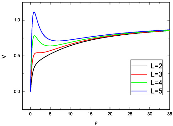 It is not difficult to find that the peak of the effective potential energy increases with the increase of L, and it can also be seen that the photon energy at infinity is 0, corresponding to the residual energy of the photon. When the separation parameter , other conditions remain unchanged, and only the angular momentum is changed, as shown in Figure 4: