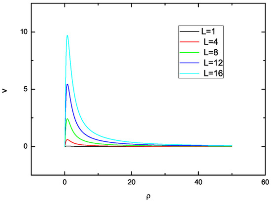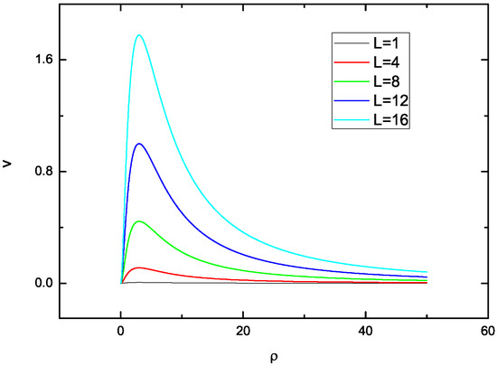 Figure 1 fixed the angular momentum parameter L = 5, making the separation distance parameter a = 0, 3, 5, 8. Observe the change of the effective potential with a single variable . Figure 2 fixes the separation distance a = 7, making angular momentum L = 0, 1, 2 … 10. Observe the change of the effective potential with a single variable L. As goes to infinity, it is clear from the two diagrams that the relativistic effective goes to 1, and the Newtonian potential of a free particle at infinity from the gravitational source should be equal to zero, and we usually specify that the Newtonian potential at infinity is equal to zero, and that is where the relativistic effective potential is different from the Newtonian potential. Since we take c = 1, m = 1 per unit mass, and the total energy of a free class particle at infinity is its rest energy, according to Einstein’s equation of mass and energy, we can very well explain why relativistic efficiency tends to number 1, whether it is changing the angular momentum or changing the separation distance. When is 0 in the effective potential energy expression, it corresponds to the effective energy of the photon. Now, take a = 0 and the angular momentum L as 1, 4, 8, 12, 16, respectively, and the effective energy of a single RN black hole with a mass of 3 can be obtained, as shown in Figure 3: