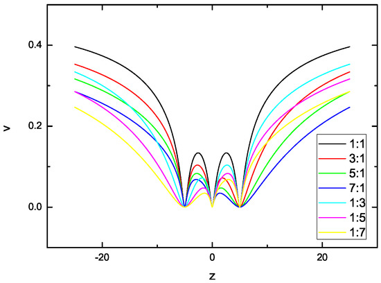 It is clear from the graph that there is a stable equilibrium point at z = 0, but there is a black hole, so it is not necessary to discuss stability here. We also found that there is an unstable equilibrium point between 0 and 5 and 0 and −5, and when the mass ratio changes, we find that the equilibrium point changes, always in favor of the small mass black hole. Now, let us look at the separation distance between the black holes when the masses are the same a pair, and the effective potential is the effect of the energy curve.