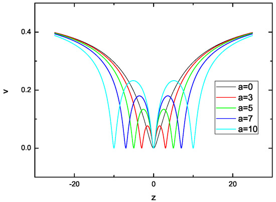 It can be seen from Figure 7 that the change of separation distance a does not change the shape of the effective potential. The separation distance a of only changes the peak value. When the value of a is relatively small, the equilibrium position of the effective potential is small. When the value of a is relatively large, the equilibrium position of the effective potential is higher. The reason is very simple. Similar to Newtonian mechanics, the lifted object has gravitational potential energy. When the separation distance a is larger, it is equivalent to the higher the object is lifted, the greater the gravitational potential energy will be, so the effective potential peak here will also become larger.