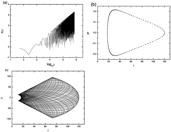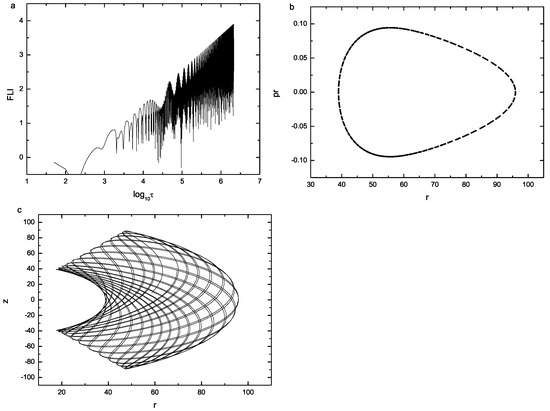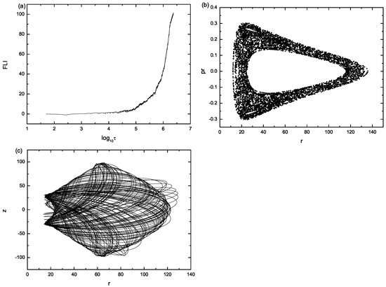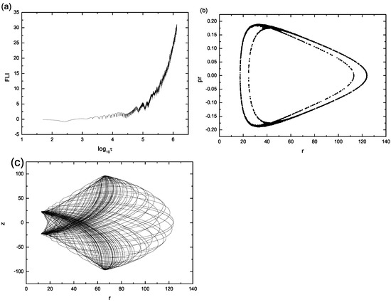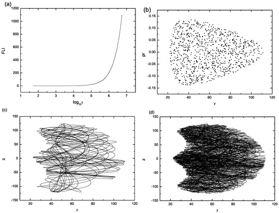 According to Figure 13a, it can be seen that the FLI agreed explosive growth, Poincare Figure 13b a scatter scattered, and can be seen from the two track projection particle movement desultorily, trajectory Figure 13c,d, respectively, for a short time and long time integral effect, it can be seen that the longer the particle movement, the more chaos, thus it can be concluded that this type of chaos is strong!