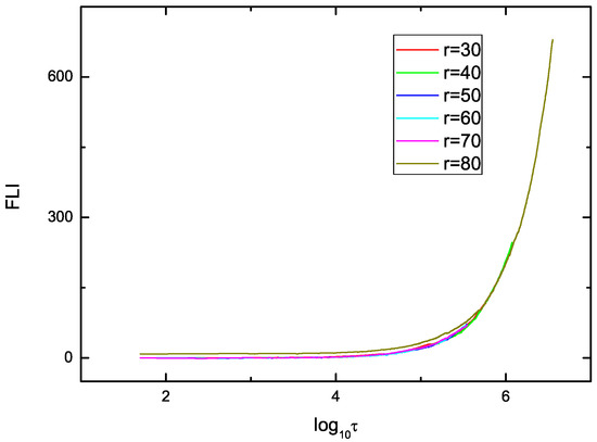 According to Figure 14 FLI alone, it can be seen that the growth pattern of the FLI curve is almost the same even if the initial position R of the tested particle is different. Therefore, it can be judged that the change of initial position R has almost no influence on the chaos of the particle under strong chaos. Next, we will discuss whether the change of A under the above determined parameters can influence the chaos of the particle. Now, take a = 20, 50, 100 and draw the figure as follows.