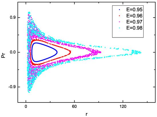 Then, we test whether the energy change of particles will have an impact on chaos. Now we choose a = 7, L = 4.8, M1 = M2 = M3 = 1, r = 38, pr = 0.1, z = 0 and pz = 0.1 for discussion. Take the energy E = 0.95, 0.96, 0.97 and 0.98 as the figure below.