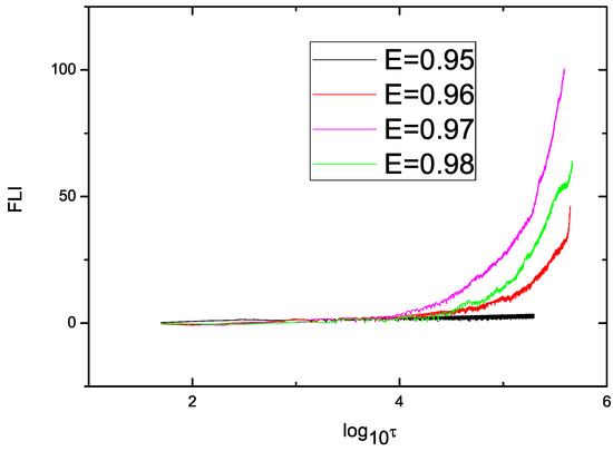 It can be seen from Figure 16 that when the energy is 0.95, the Poincare cross-section is a closed blue curve, indicating that this is an ordered orbit. When the energy is 0.96, the red curve is no longer closed and scattered points appear, and weak chaos has been generated. Look at the Figure 17 again now, when the energy is 0.95, the FLI agreed indicators were not puffed up, also indicates the orderly orbit, but when energy increase to 0.96, the red FLI agreed in a significantly upward curve, as E = 0.97, 0.98, and became warped on the more obvious, at this time as the chaotic orbits, combined with the Poincare section and the FLI, which agreed to a qualitative description when the experimental particle energy increases, the particle tracks may vary from order to chaos.