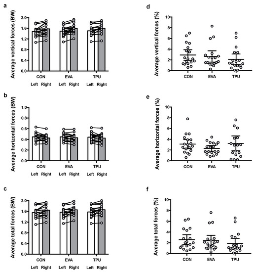 Kinetics variables for both legs (left panels) and symmetry angle scores (right panels) during the repeated sprint exercise in three different footwear conditions (CON = shoes only; EVA = shoes + ethyl-vinyl acetate orthotic; TPU = shoes + expanded thermoplastic polyurethane orthotic). (a,d) Average vertical forces. (b,e) Average horizontal forces. (c,f) Average total forces. Values are mean with 95% confidence interval (n = 18). Symmetry angle score of 0% indicates perfect symmetry and 100% indicates perfect asymmetry.