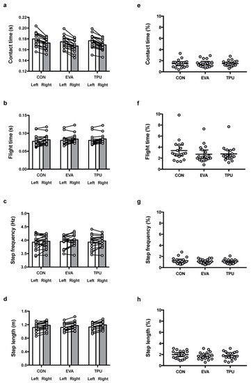 Spatio-temporal variables for both legs (left panels) and symmetry angle scores (right panels) during the repeated sprint exercise in three different footwear conditions (CON = shoes only; EVA = shoes + ethyl-vinyl acetate orthotic; TPU = shoes + expanded thermoplastic polyurethane orthotic). (a,e) Contact time. (b,f) Flight time. (c,g) Step frequency. (d,h) Step length. Values are mean with 95% confidence interval (n = 18). Symmetry angle score of 0% indicates perfect symmetry and 100% indicates perfect asymmetry.