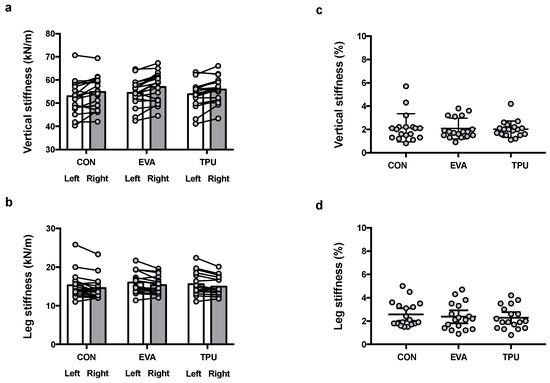 Spring-mass characteristics for both legs (left panels) and symmetry angle scores (right panels) during the repeated sprint exercise in three different footwear conditions (CON = shoes only; EVA = shoes + ethyl-vinyl acetate orthotic; TPU = shoes + expanded thermoplastic polyurethane orthotic). (a,c) Vertical stiffness. (b,d) Leg stiffness. Values are mean with 95% confidence interval (n = 18). Symmetry angle score of 0% indicates perfect symmetry and 100% indicates perfect asymmetry.
