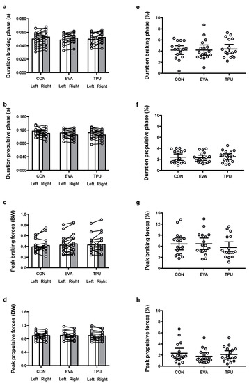 Horizontal force production variables for both legs (left panels) and symmetry angle scores (right panels) during the repeated sprint exercise in three different footwear conditions (CON = shoes only; EVA = shoes + ethyl-vinyl acetate orthotic; TPU = shoes + expanded thermoplastic polyurethane orthotic). (a,e) Duration braking phase. (b,f) Duration propulsion phase. (c,g) Peak braking forces. (d,h) Peak propulsive forces. Values are mean with 95% confidence interval (n = 17). Symmetry angle score of 0% indicates perfect symmetry and 100% indicates perfect asymmetry.