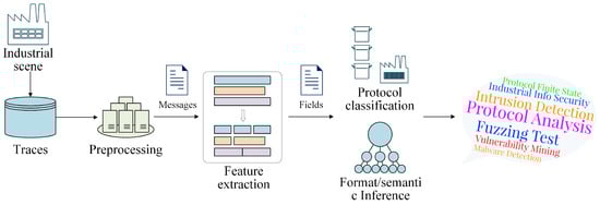 At present, research on PRE revolves around several methods, such as bioinformatics algorithms, statistical analysis, data mining, and natural language processing. The approximate process of PRE for ICP is shown in Figure 1. For the internet protocol Meng F [10], a binary protocol inversion method combining hierarchical clustering and probabilistic alignment was proposed. The algorithm mainly parsed the frame format of the protocol at the byte level, but the inference affected paragraphs and keywords in general.