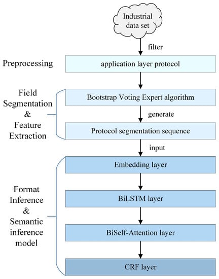 The format and semantic inference of the protocol employs a bidirectional long short-term memory conditional random field model, which is a neural network that is effective for modeling sequential data. The network consists of long short-term memory (LSTM) cells that can store and access information over a prolonged period, and conditional random fields (CRF) that model the dependencies between different elements of the sequence. The attention mechanism allows the network to selectively focus on different parts of the input sequence, enabling it to attend to the most relevant information, and to make more accurate predictions.