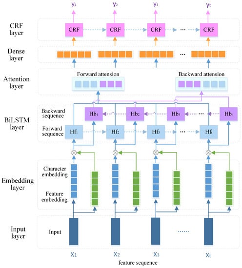 where is the output of the forward attention layer, and is the output of the backward attention layer. BiLSTM-AM obtains annotations for a given feature sequence, by linking and ; then, through the dense layer, we concatenate the output vector and , and the BiLSTM output into a vector to represent each field. The vector is fed to a function, to produce the output of attention layer.